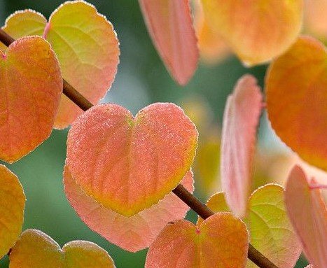 Rounded, heart-shaped leaves emerge as a purple shade, mature to a blue-green, and eventually change to an apricot-orange shade in the autumn. The fruit are small, banana-shaped pods that grow in clusters of 2 to 4.