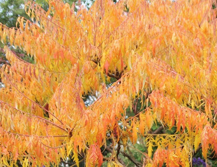 The fruit are hairy, crimson-colored drupes that grow in panicles and hold their color until the following spring. Foliage emerges as bronze-yellow new growth, matures to shades of yellow in the summer, and fades to oranges and reds in the autumn.
